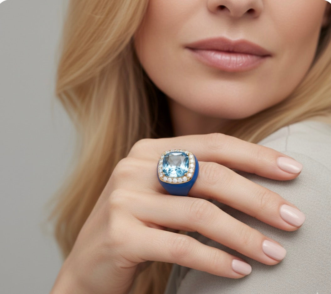 Enamel, cubic zirconia and gold vermeil ( silver with a thicker layer of 18ct. Gold. Adjustable size