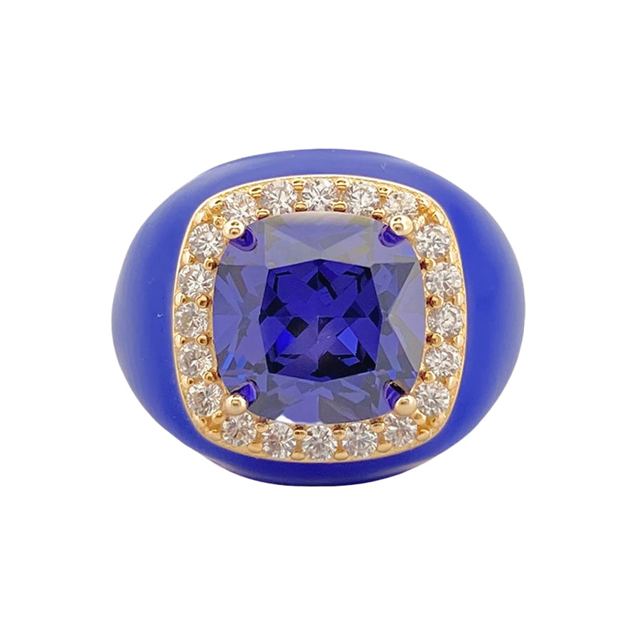 The ring's enamel design and stone create a seamless, cohesive look, with both elements being of the same color, making it a truly standout piece. The addition of little white cubic zirconia stones creates an extra level of glamour and sparkle.