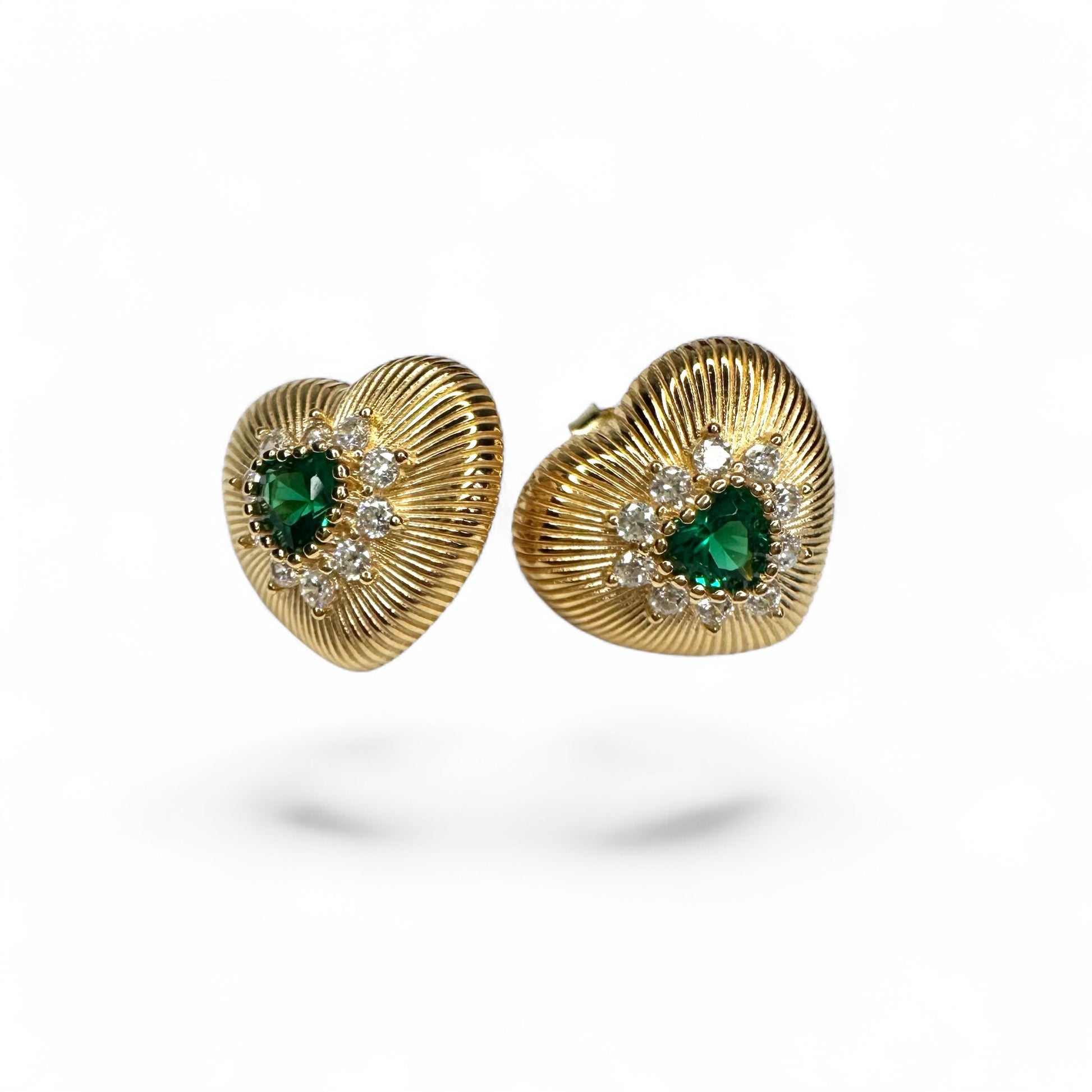 Fall in love with these radiant heart-shaped earrings, crafted in luxurious gold vermeil. A sparkling cluster of cubic zirconia surrounds a vivid emerald-green center stone, adding timeless elegance and a touch of modern romance. Perfect for elevating any look — from everyday chic to evening glamour.