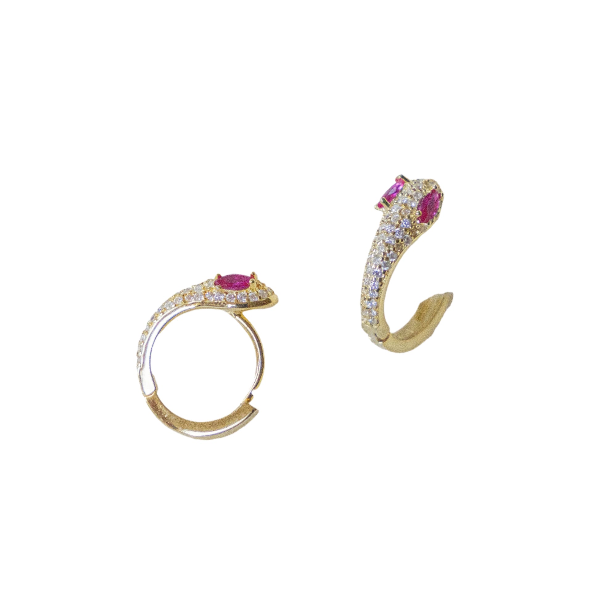 The snake design adds a unique and edgy vibe to earrings, symbolizing transformation and rebirth. Striking contrasts with a sparkling cubic zirconia and a vivid ruby. Bold and sophisticated.