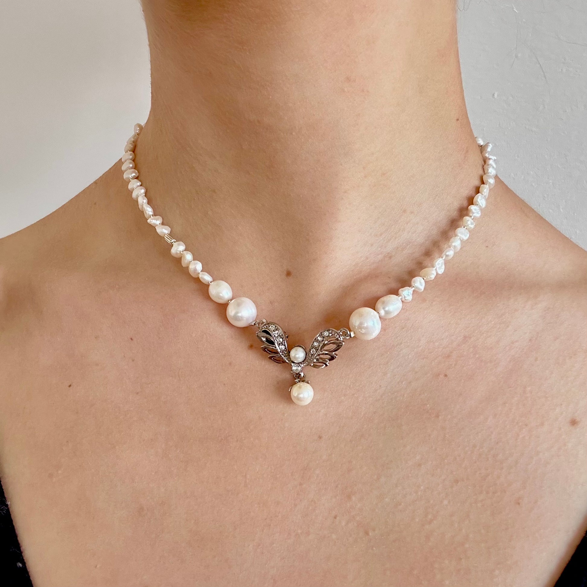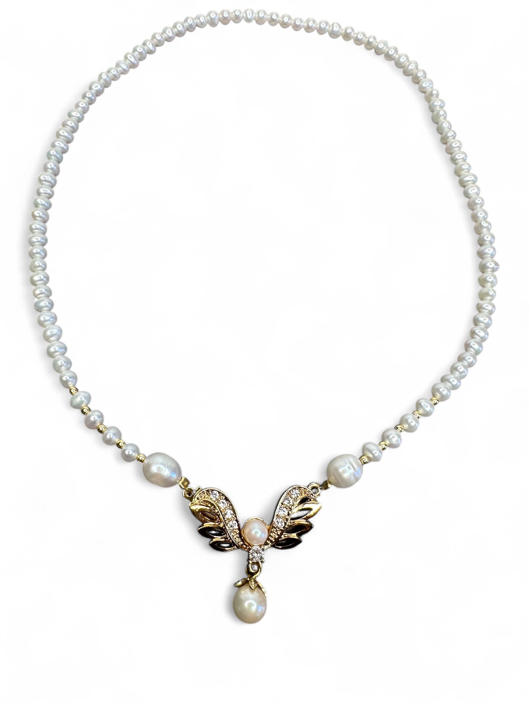 This beautiful and special pearlecklace is for now and years to come. Unique with the eagle wings clasp in silver covered with 24ct gold, and the combination of of irregular sweet water pearls with larger salt water pearls and cubic zirconia. From the sea to the sky!